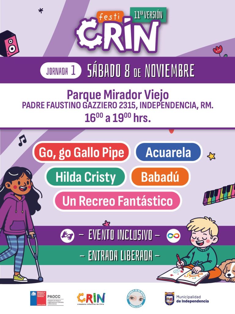 ¡Este sábado 08 de noviembre te invitamos al Parque Mirador Viejo a celebrar el Día Mundial de la Infancia en FestiCrin, un evento musical para niños y niñas! Tendremos bandas invitadas y muchas actividades ¡Te esperamos!