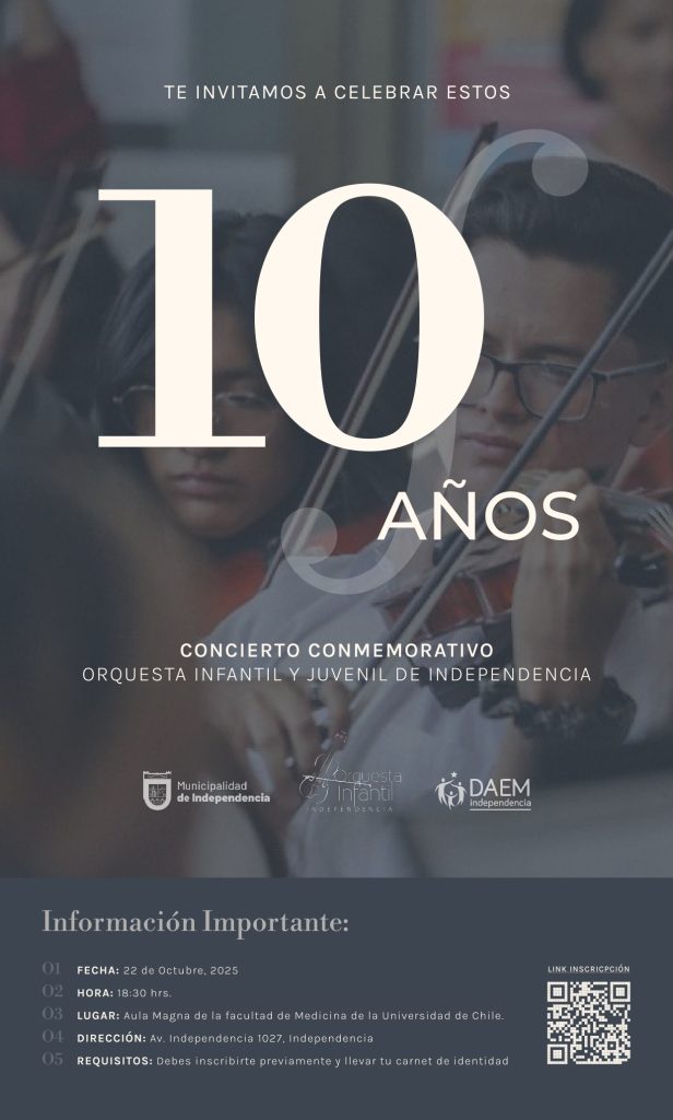 Junto con saludarles, compartimos con ustedes una invitación muy especial: la Orquesta Infantil y Juvenil de Independencia cumple 10 años de trayectoria, y lo celebra con un concierto conmemorativo abierto a la comunidad.